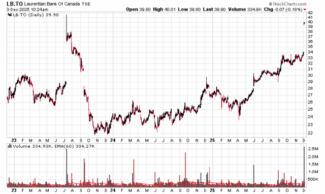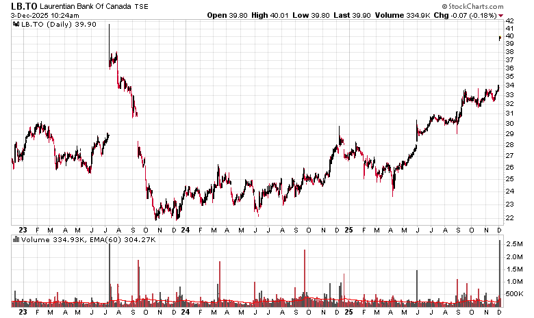 Laurentian Bank (TSX: LB) finally found its solution to its years-long strategic review and found a way to carve itself out to various suitors, leading to a CAD$40/share cash buyout offer. The three year history of the stock graph pretty much tells the story – with the prior outsider CEO in 2023 getting fired for not being able to sell the company, and new management being successful:
